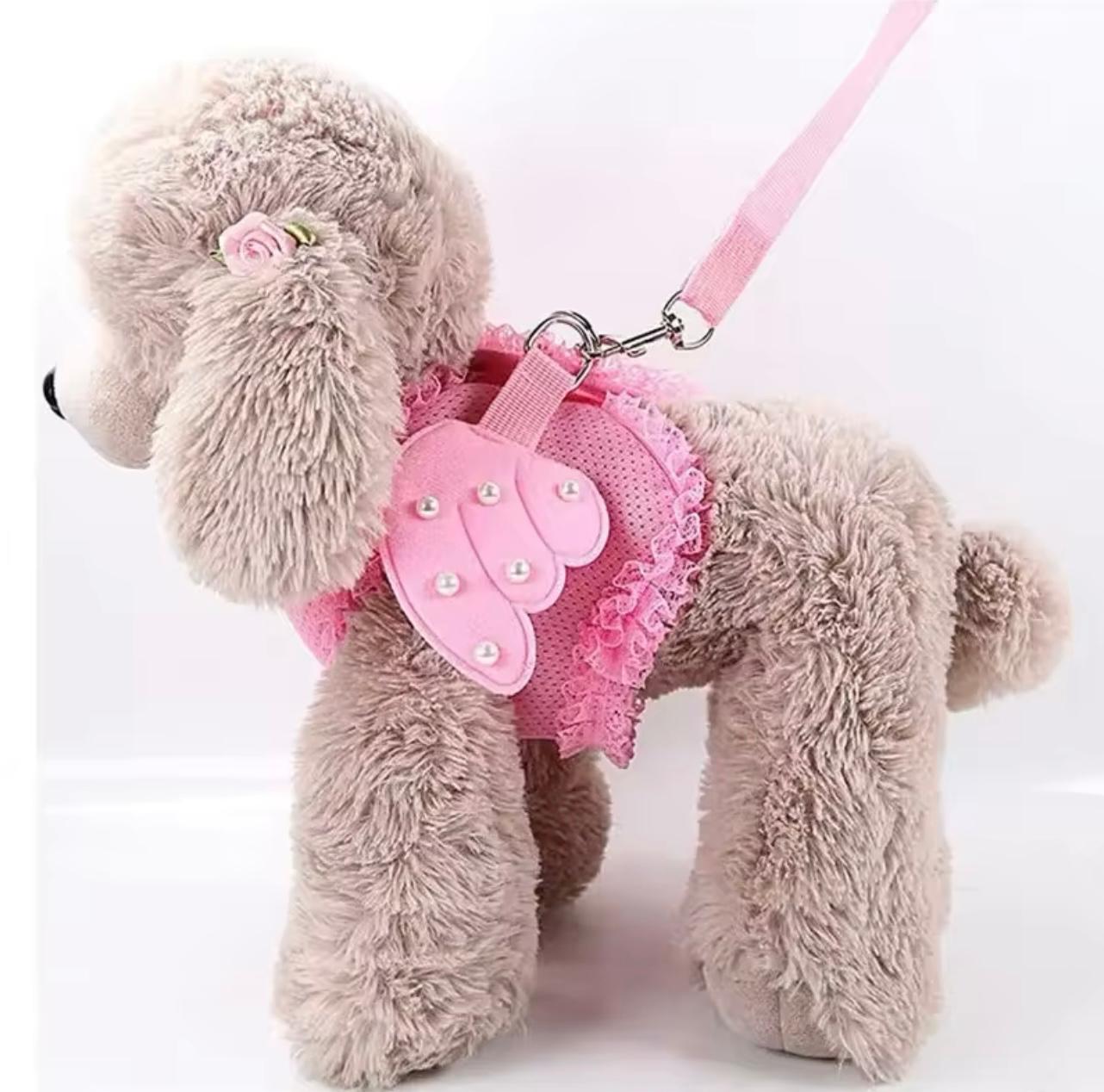 Pink small dog harness with angel wings.